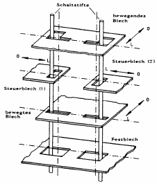 a - yellow: control resp. moving plate b - blue: control resp. moved plate c - gray: base of fixed plate s - red: switching pin |