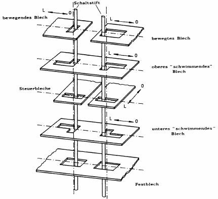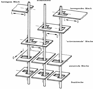 There is nothing in the documentation that dictated this particular layout, but it shows how address decoding could be implemented with mechanical parts. The yellow plates are inputs, blue plates are output. Black is the clock, green are intermediate plates. Red are switching pins. |