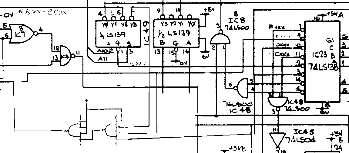 The default (minimum) ATOM had the following memory map (hex numbers are proceeded with an '#': #F000-#FFFF ROM MM52164 IC20 OS ROM #C000-#CFFF ROM MM52164 IC20 Basic ROM #B000-#B3FF PPI INS8255 IC25 Keyboard, Tape I/O, Speaker #8000-#83FF RAM 2114 ICs 42&43 Graphics and Basic RAM #0000-#03FF RAM 2114 ICs 51&52 Stack and scratch RAM Extensions: #D000-#DFFF ROM MM52132 IC21 Floating point ROM #E000-#EFFF ROM MN52132 Disk Operating System ROM #B800-#BBFF VIA 6522 IC1 Printer Interface #B400-#B7FF Extension PL8 Econet Interface #A000-#AFFF ROM MN52132 IC24 Utilities ROM #9400-#97FF RAM 2114 ICs 32&33 Graphics RAM #9000-#93FF RAM 2114 ICs 34&35 Graphics RAM #8C00-#8FFF RAM 2114 ICs 36&37 Graphics RAM #8800-#8BFF RAM 2114 ICs 38&39 Graphics RAM #8400-#87FF RAM 2114 ICs 40&41 Graphics RAM #3C00-#7FFF Extension PL6/7 Reserved for external RAM #3800-#3BFF RAM 2114 ICs 18&19 Basic RAM #3400-#37FF RAM 2114 ICs 16&17 Basic RAM #3000-#33FF RAM 2114 ICs 14&15 Basic RAM #2C00-#2FFF RAM 2114 ICs 12&13 Basic RAM (FP?) #2800-#2BFF RAM 2114 ICs 10&11 Basic RAM #0400-#27FF Extension PL6/7 Reserved for Eurocards When RAM is placed at #2800 and up, the Basic text is placed there, leaving the #8000 and up region for graphics. The Disk Operating System expansion card added the following to the memory map: #Exxx ROM #0A00-#0A7F 8271 FDC #0400-#09FF RAM Non-Acorn modifications: ROM SWITCHING A single utility ROM was not enough, as many ROMs were devised, so a switching card was created, which could map one of several ROMs on the #A000-#AFFF location. The OS ROM at #F000-#FFFF was changed, allowing automatic paging looking for the command to be executed. This mechanism is similar to the BBC ROM switching. The switching is done with port #BFFF. CMOS RAM The 2114 RAM ICs were not very economic in power consumption, which could lead to power supply problems in extended Atoms. This led to the development of CMOS RAM cards. Initially these cards supplemented the standard memory with a new block from #4000 to #7FFF. Per 2 kByte chip a battery backup and/or write protect could be used. With the falling RAM prices and increasing capacities, eventually the complete lower 32K region was covered. As the PL6/7 buffer assumed the memory ranges #0400-#27FF, #3C00-#7FFF and #Exxx were external, some modification to the mainboard was needed. Graphics RAM in CMOS. The graphics region spanned #84xx-#97xx, or 5 kByte. A 8 kByte CMOS RAM chip replacing the 2114s reduced power consumption and supply additional RAM space, not used by the OS. The covered memory would run from #8000 to #9FFF. More disk capacity, CP/M The original 8271 Floppy Disk Controller chip supported only single density, and the operating system only single sided, 40 track disks. And the chip is unavalilable from the original sources. As an alternative to upgrading the FDC and patch the DOS, the decision was made to combine the project with support for a popular OS of the time: CP/M. A board containing a Z80 CPU, 64 kByte RAM, WD1793, and a interface Z80 PIO was designed. With a small change in the Atom DOS ROM and some basic intelligence in the Z80 boot ROM, both Atom FDC emulation and CP/M support was archieved. Adding an 80 colomn VDU card completed the CP/M configuration. The communication between the Atom and the Z80/FDC card was done via an VIA card. This card implemented an extra 6522 VIA, two 4 kByte ROM sockets and a 2 kByte RAM socket at #0400. The ROM sockets could be mapped from #9xxx to #Fxxx. The primary purpose was to provide a DOS ROM at #Exxx. Mapping #Axxx and #BC00-#BFFF outside the bus This was done with a simple modification called "daktuin" (roof garden).. The signal used to switch #Exxx to the outside of the bus, is now modified to switch #Axxx and #BC00-#BFFF too. When placed in the context, the "daktuin" looks as follows: