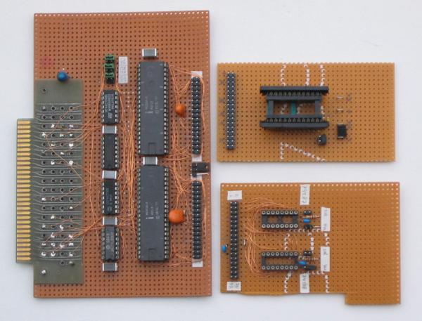 At the lower right a daughterboard for 74287 and 74288 PROMS. Above that the 2708 EPROM reader board. This EPROM type and its predecessors are often absent from EPROM-programmers because they need multiple power supplies like +12V and -5V.