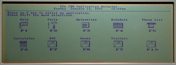 The Convertible was also IBM's only PC (XT) with standard a battery back-upped clock. Shown here is the Convertible with a typical application, the Application Selector, which runs only on a Convertible. It can still be downloaded from the IBM site. Battery data: 9.6v/2400mAh (NiCd). The power supply is 15 VDC, 2.7A and the pin is plus (barrel minus). |