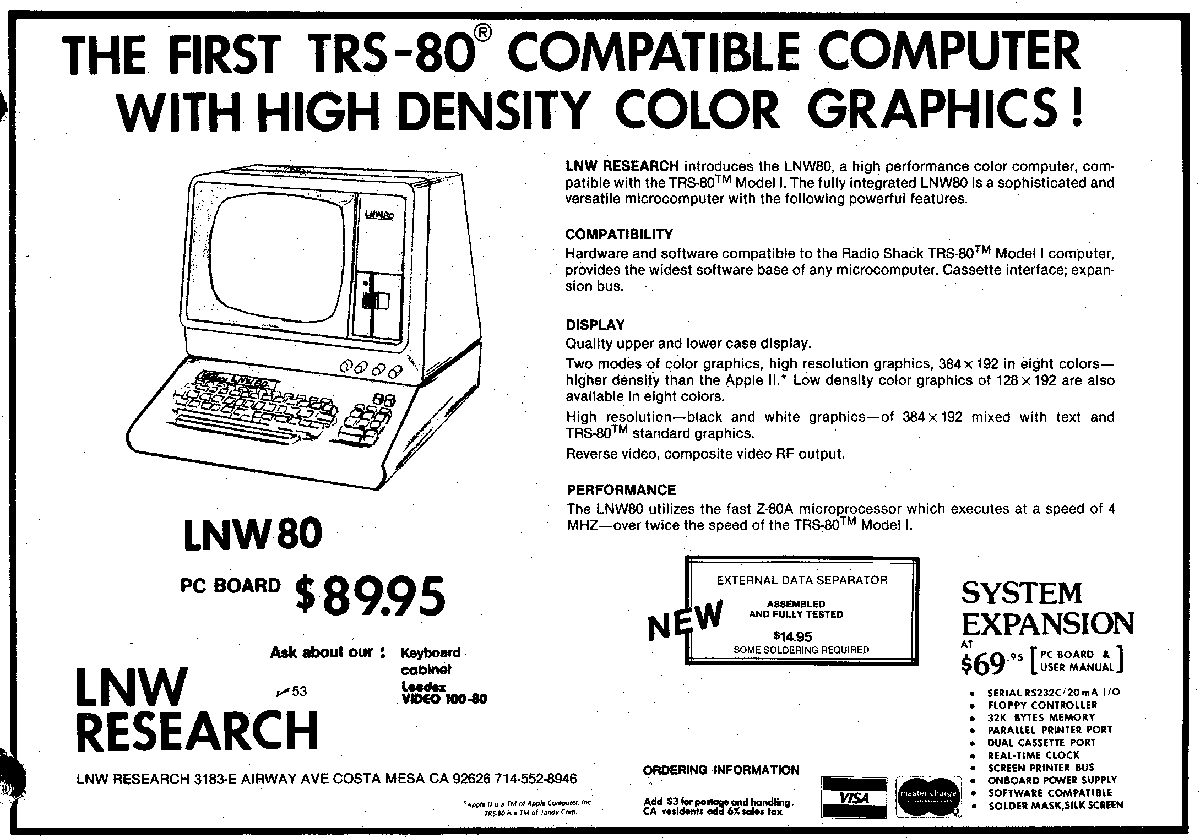 The LNW80 computer main board contained the TRS80 model 1 functionality at 1.77 or 4 MHz processor clock and hires video and color support. The keyboard included some extra keys (control, caps lock, F1, F2, reset). Sandwiched on the mainboard fitted the System Expansion board containing the TRS80 Expansion Interface funcionality. An LNDoubler completed the set. The color add appeared first in January 1982, and was the back page of 80 Micro since September 1982.