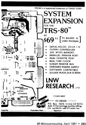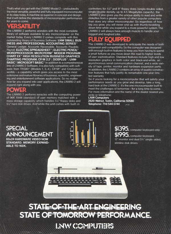 The first advertisement of the LNW 80 computer appeared in the November 1980