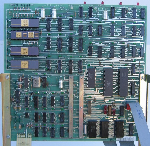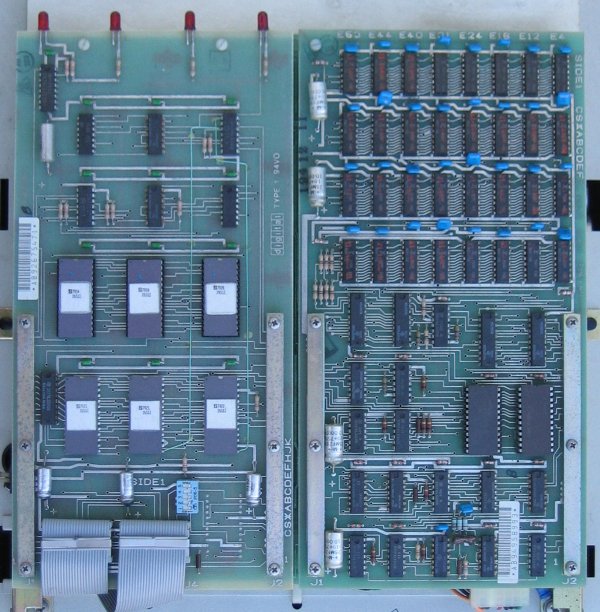 The RAM chip type is Fujitsu MB8116 (16k x 1), So total RAM is 64 kByte, or more likely 32 kWord. The flatcables at the lower left lead to the serial port boards. The UARTS are Signetics 2651. The LEDs (top left) are the front panel indicators. |