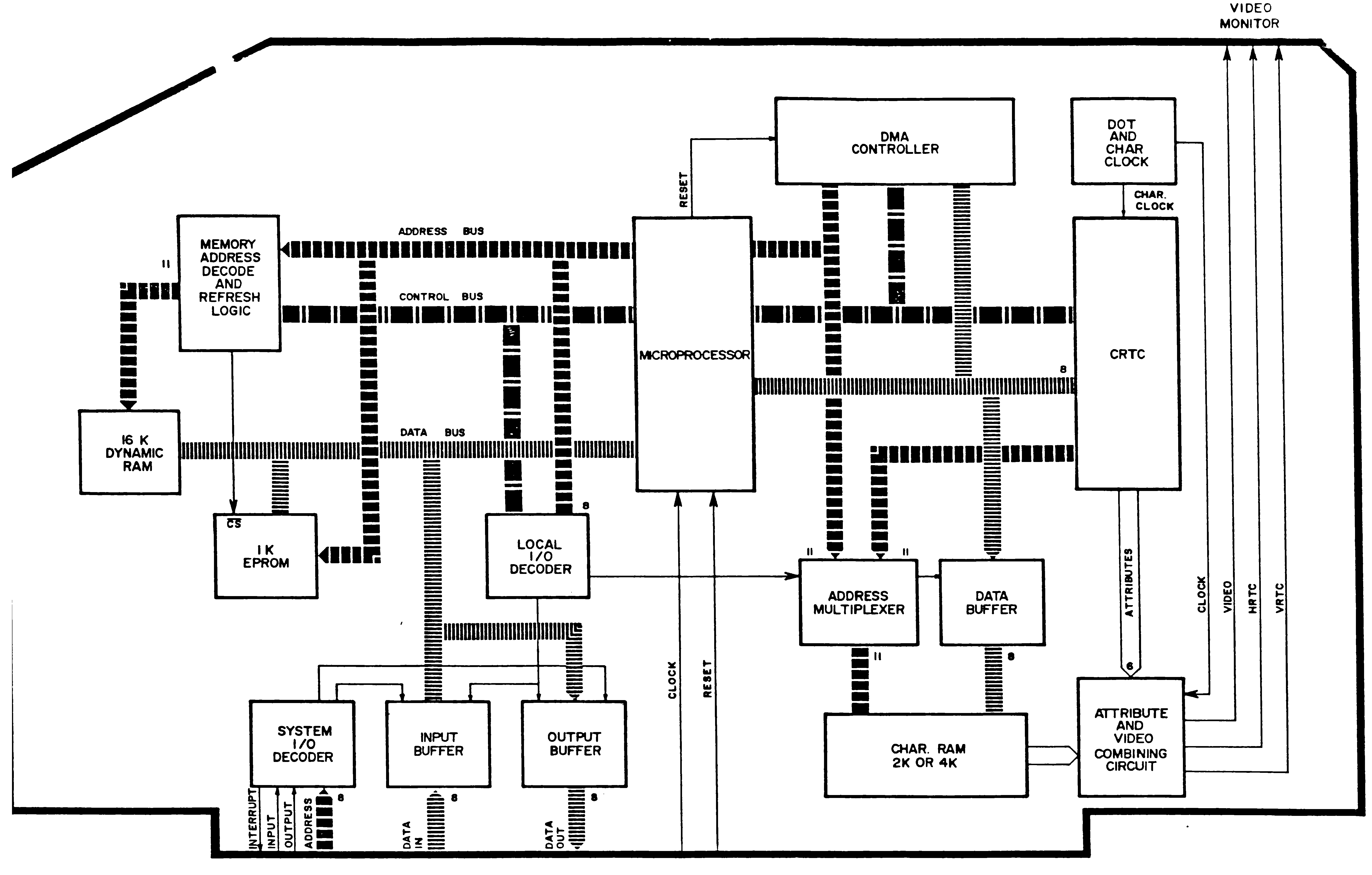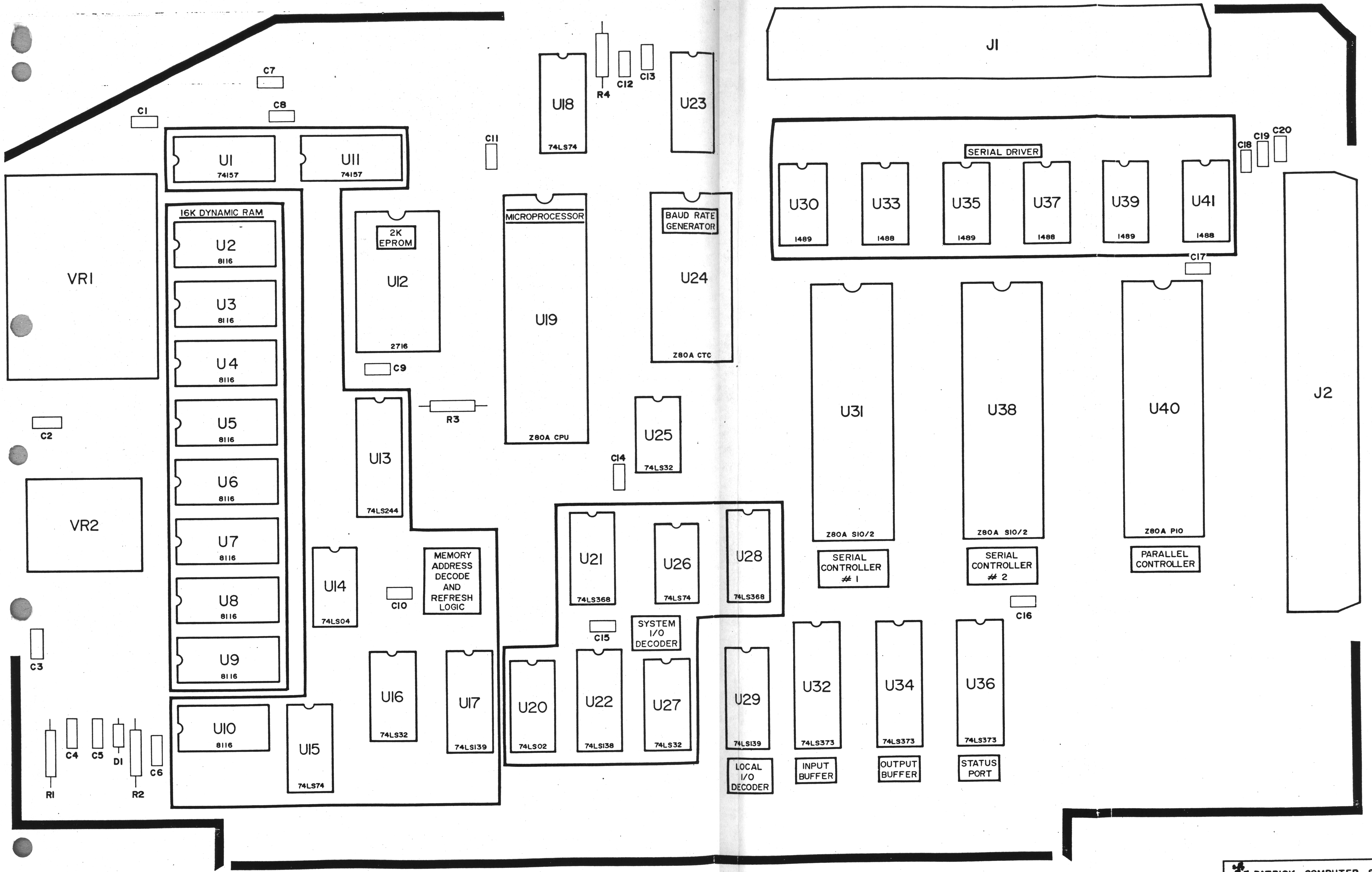 Z80 CPU, EPROM (1 kByte), parallel ports for keyboard and daisy wheel printer and 16 kByte dynamic RAM.