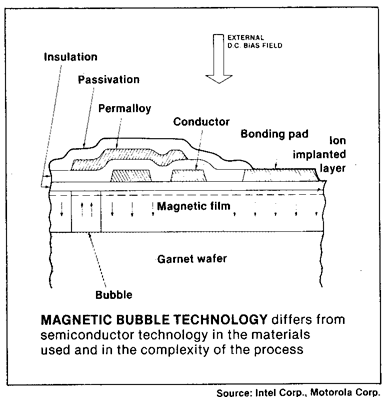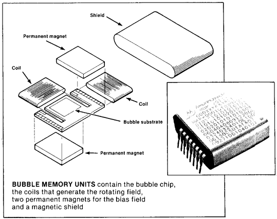 Therefore Intel (yes, they were in the memory business then) and others looked for alternatives. Bubbles were one of them. It is easiest to see bubble memories as floppies, but only the bits (bubbles) rotate. The medium, or 'disk' is stationary.