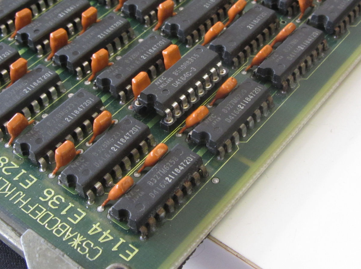 This dynamic RAM board has 9 * 8 NEC4164: 256 kWord with parity. This is more than enough for running (small) programs. Once the Boot/Diagnostics ROMs started working, it reported RAM errors: ERR 3 MEMORY FAULT ADDRESS EXPECTED ACTUAL 00400000 177400 177600 FF00 FF80 > D7 bit stuck on 00400000 052525 052725 5555 55D5 > D7 bit stuck on 00420000 177400 177600 00420000 052525 052725 ....With the User Guide available, this appeared to be bit 7 of row 1, IC 135. Replaced this with a NEC D4164-3 (150 ns), and the errors were gone.