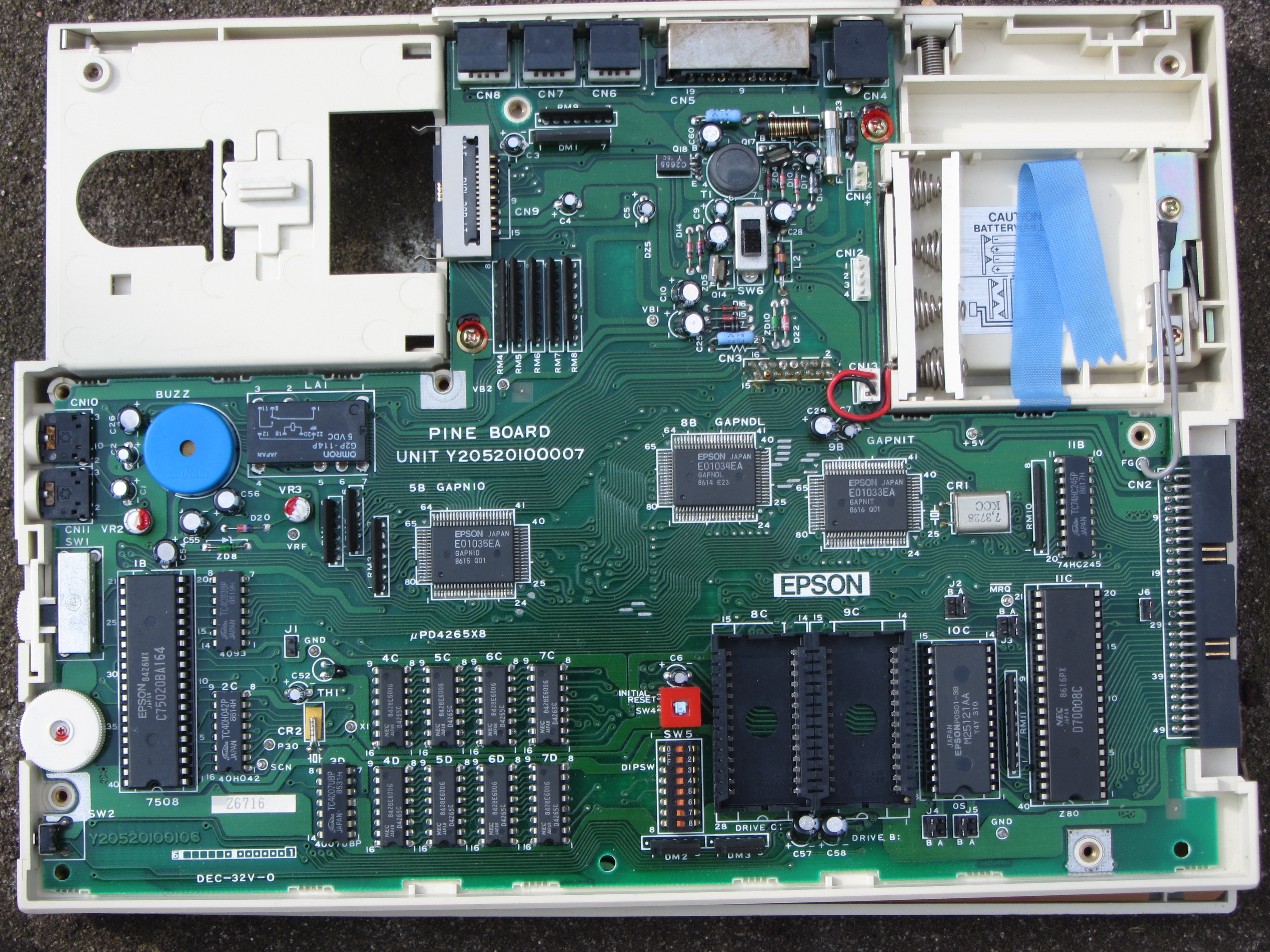 Between the battery compartment and cartridge-bay two connectors suggest an interesting, but unknown option. There is also a socket for a permanent OS ROM extension ROM. |