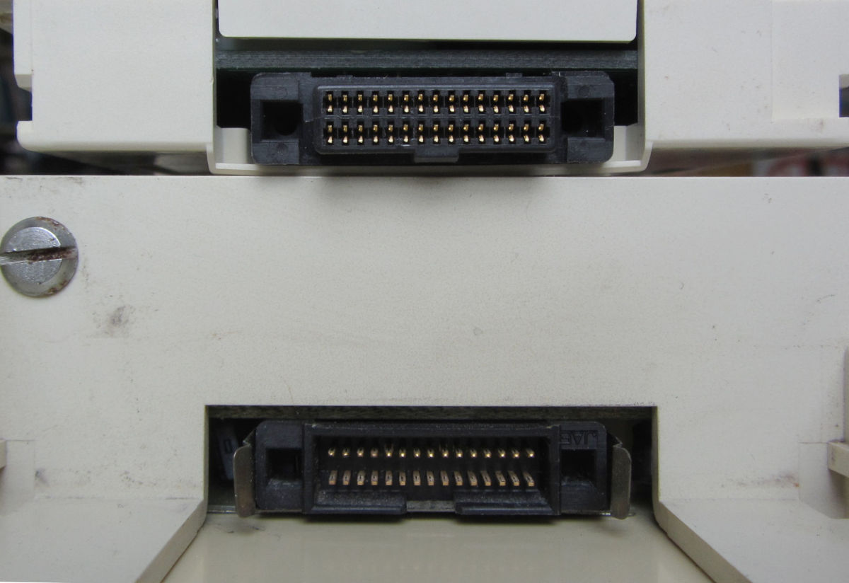 The cartridge connector, PX-4 side at the bottom, cartridge side at the top. The Operating System Reference Manual names it PICL-30S-LT from JAE, Japan Aviation Electronics. |