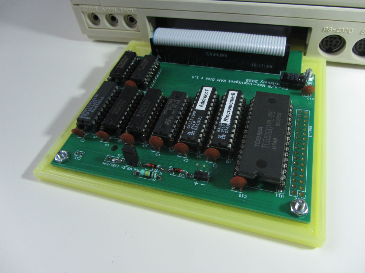The Operating System Reference Manual also has info on the 'Non-Intelligent' RAM Disk. These devices didn't exist as stand-alone device but were combined with other devices like the 'Japanese-language processing unit', ROM capsules, direct modem or the 'Synchronous communication unit'. The 'Non-Intelligent' RAM Disk is I/O mapped, and uses ports to specify the address and read/write data. One extra port is used for the Command/Status registers. One extra feature makes this device not trival to recreate; the lower address byte is self- incrementing, after each read or write the value is incremented. So each successive data read/write will use the next memory location. This allows for fast reading and writing (Z80 processor OTIR and INIR instructions). The 'Non-Intelligent' RAM Disk uses I/O ports 90h to 94h.