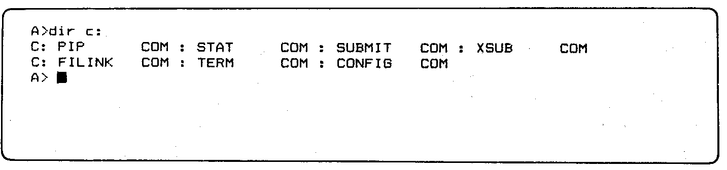 If the sequence of clearing the screen and printing two directories of the C: drive is performed with screen 1 turned on (it can be chosen by using the CON-FIG program described in Chapter 3), then the screen will show the following output.