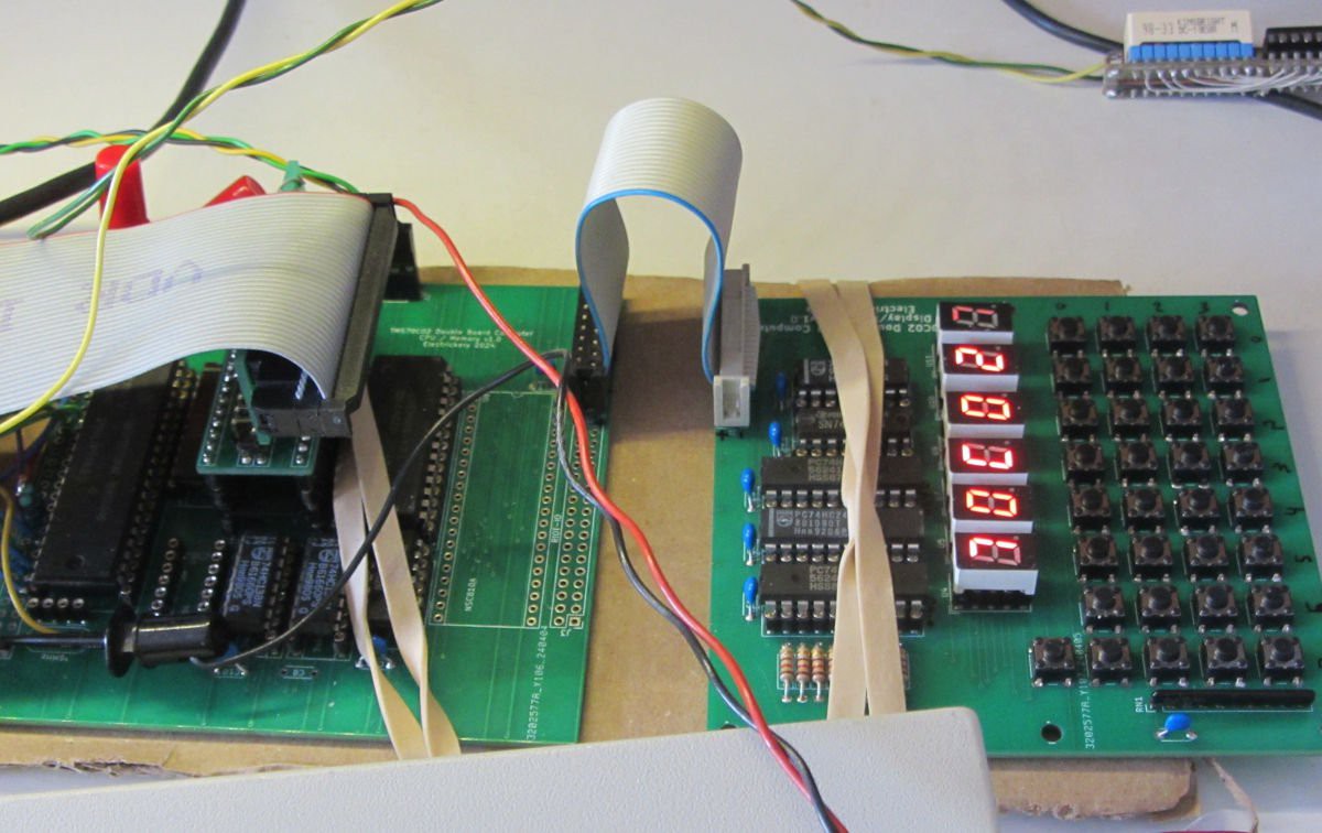 The current board attached to the ROM-emulator, with HEX-display & keyboard.