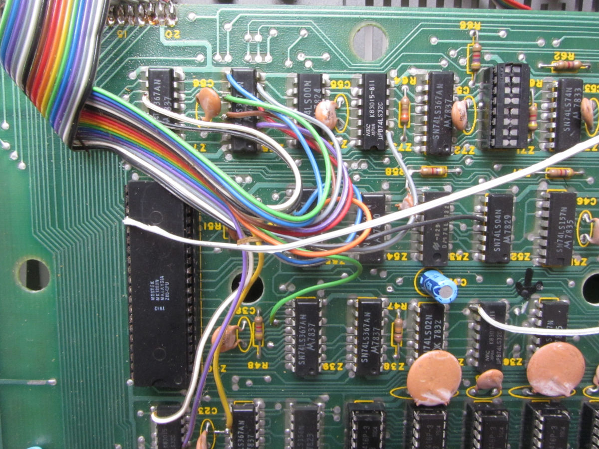 The HRG1 is connected to the TRS-80 with two flatcables: a 16 wire and a 24 wire cable. The HRG1 output is OR-ed with the original video signal. In this instance there is also an extra board connected with eight wires to the HRG.