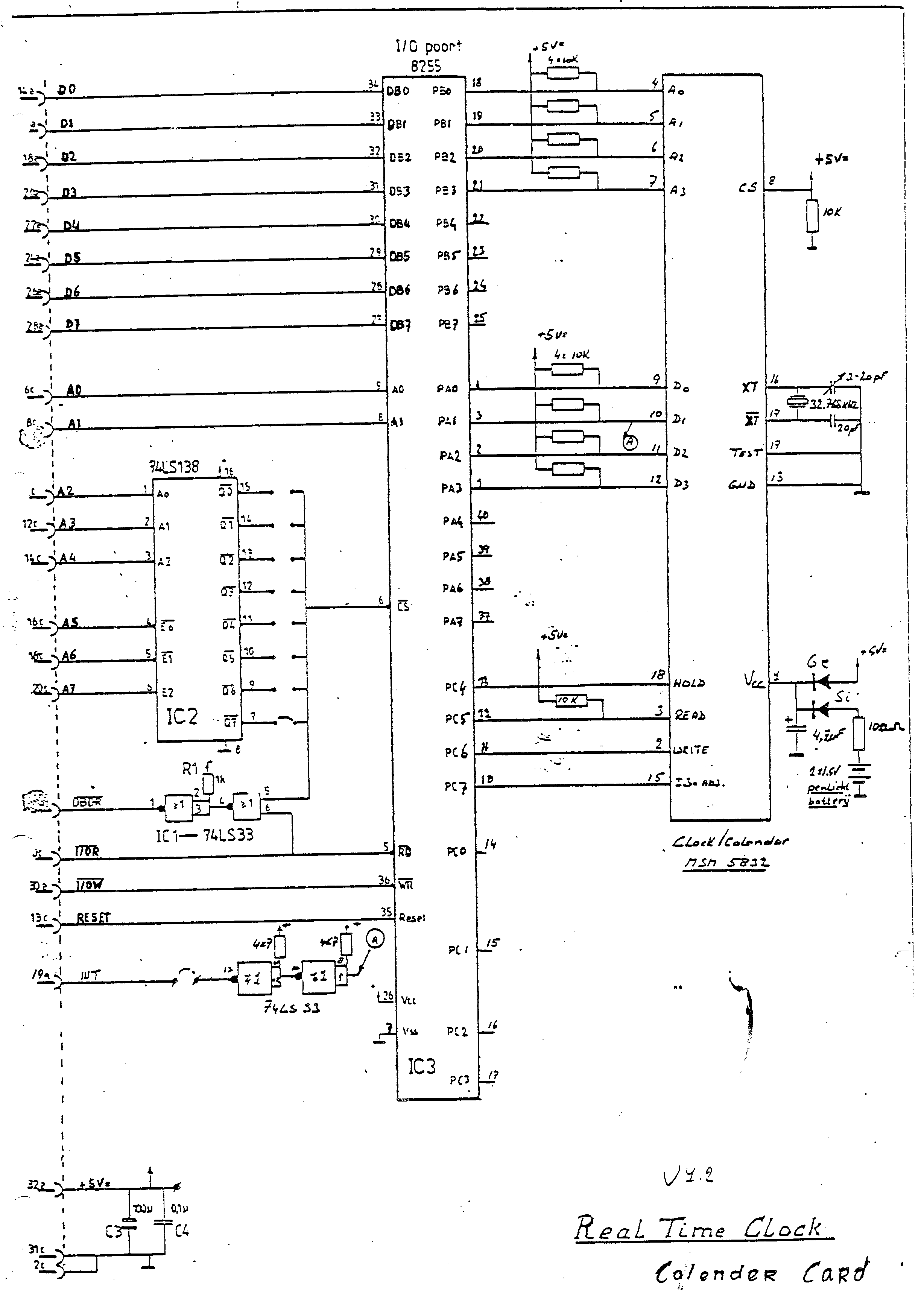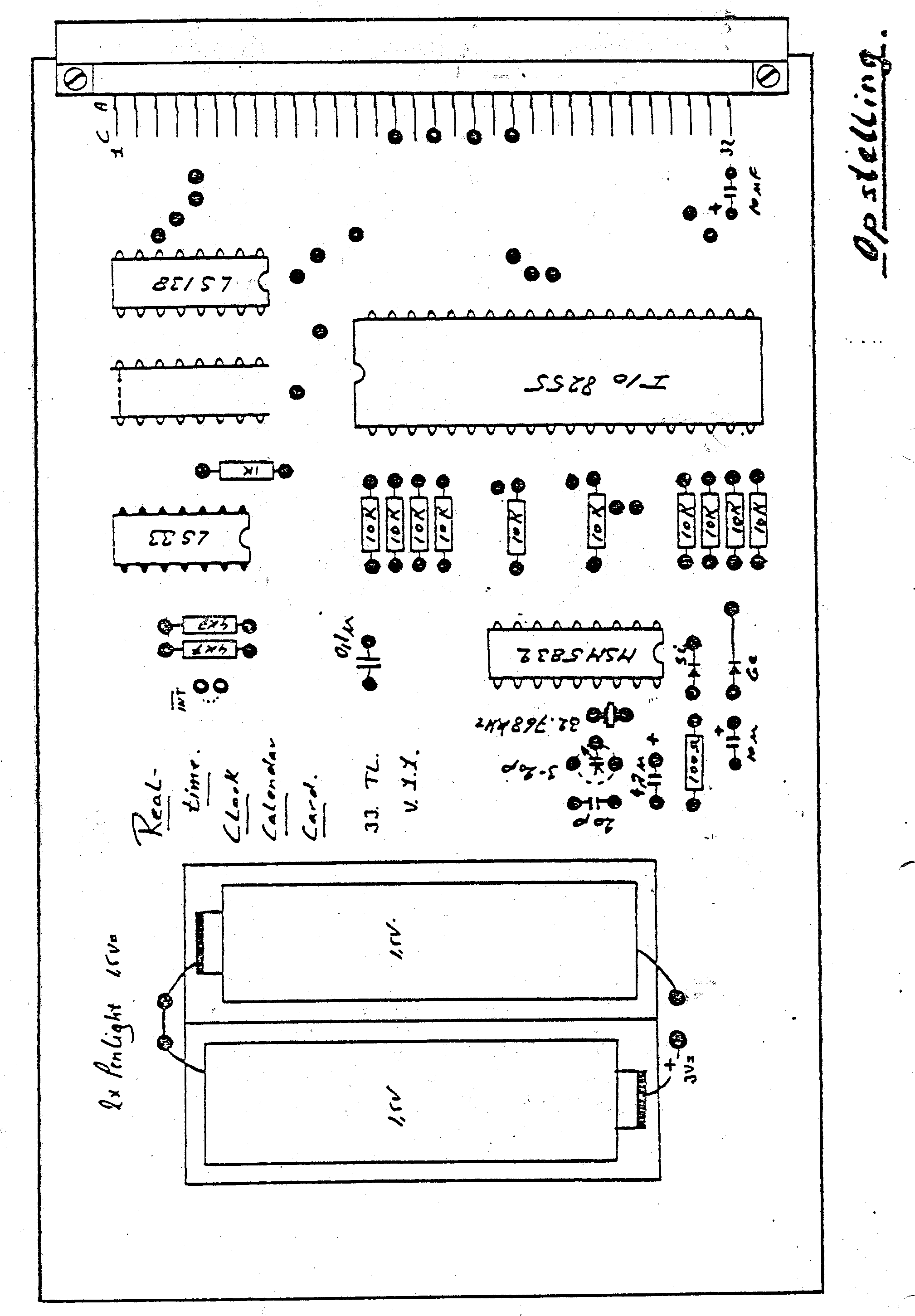 The RTCC is based on the MSM5832 Real Time Clock Calendar chip. Bus interfacing is done with a 8255 PPI chip. The schema and board design are by "JJ. TL." I bought the RTCC card as a board and description. The description also contained the listing of an assembly program used with the board. Some lines were missing from my copy and the remainder was so unclear and seemingly overcomplex to me, that I decided to write my own program. Having very limited assembly programming experience, it took me quite a while. The set was bought in 1985, the software completed in 1989. A small exuse is that I got the 5832 datasheet only in 1988 :-). Instead of writing a stand-alone program to control the card, I decided to leave as much as possible to the DOS clockroutines. So the routines just copy the DOS clock values to the RTCC card (SETRTCC.ASM) or back (SETCLK.ASM). The Component Layout and board masks are also available. |