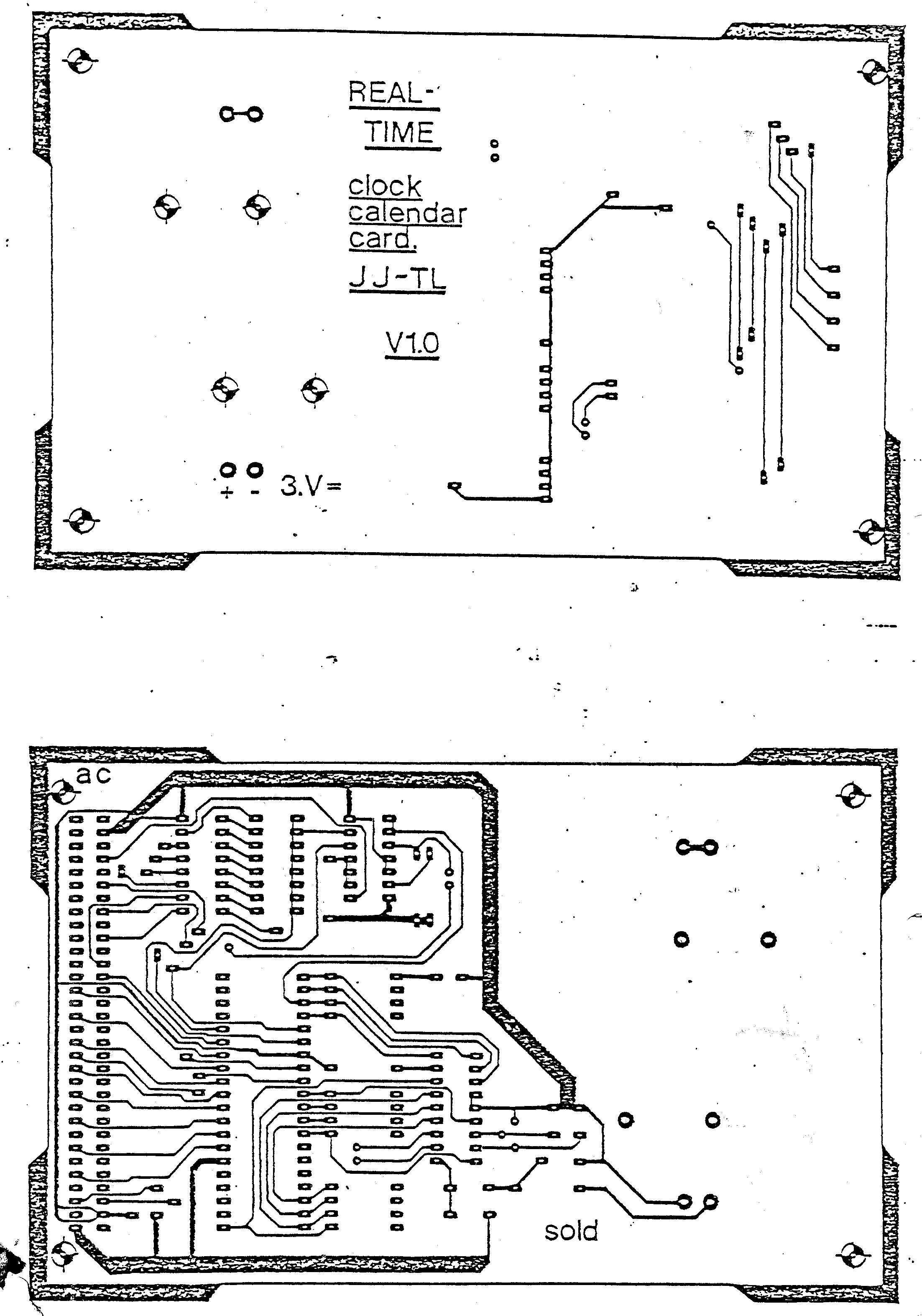 The Real Time Clock Calendar Card board is designed for usage with the "Utrecht-bus" an Eurocard based extension for the TRS-80 model 1 bus which was used by members of the Dutch TRS-80 User Group, once the largest single computer club with 4000 members. The Utrecht bus added buffering and a direction reversal signal, making it very similar to the Model 3 bus. |