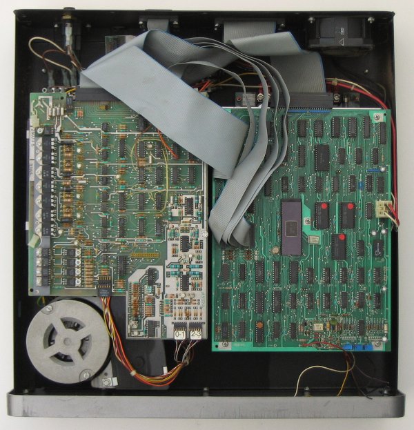 The disk is not only 8 MByte, but also 8" wide. It is below the board at the left side. On the right is the controller board, made by Tandy. Below this is the power supply. The disk is a Shugart Associates 1004. The controller used the Signetics 8x300 controller, which implemented in software the core functionality of what later became the WD1010 controller. The already existing WD1000 chipset was used for the MFM encode, decode, write precomp, etc. (Thanks to Eric Smith at the cctech mailing list). The bus between the Model II and the controller is a custom variant of the WD1002 bus. Apart from rewiring, it contained an extra address bit register for the Write Protect logic. The later Radio Shack harddisk controllers had a Model III compatible bus. This lacked the CS signal and added an EXTIOSEL signal to switch databus buffer direction. |